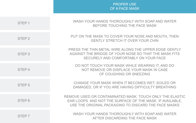 Please refer to the chart below for the proper use of a face mask and any user guide available on or inside the product packaging.